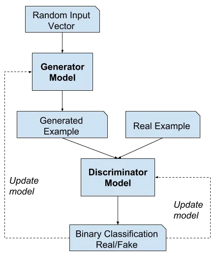 생성자 모델이 이미지를 생성한다고 가정해 봅시다. 먼저 이 모델을 이용해 여러 개의 가짜 이미지를 생성하도록 합니다. 그리고 실제 이미지를 몇 개 찾아서 이 가짜 이미지들과 결합합니다. 그런 다음, 이 이미지들을 판별자 모델에 입력하여 진짜인지 가짜인지를 구분하게 합니다. 만약 생성자 모델이 잘 작동한다면, 판별자 모델은 진짜와 가짜를 구분하기 어려워할 것이며, 진짜인지 가짜인지 맞출 확률이 약 50%에 가까워집니다. 당연히 초기에는 판별자가 더 잘 구분합니다(판별자는 보통 사전 학습이 약간 되어 있음). 따라서, 지도 학습 방식으로(우리 스스로 어떤 이미지가 진짜인지 가짜인지 알고 있기 때문에) 판별자 모델을 더 잘 학습시키게 됩니다. 또한, 생성자 모델도 판별자를 얼마나 잘 속였는지에 따라 학습할 수 있습니다. 학습은 생성자 모델이 판별자를 약 50% 확률로 속일 수 있을 때 완료됩니다.