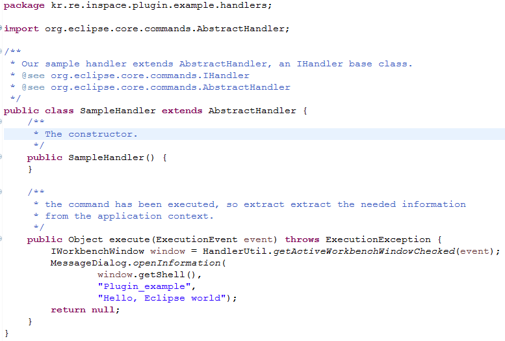Handlers는 commands로부터 명령을 받아 호출되고, 호출되자마자 클래스를 실행합니다. 클래스를 정의할 때 org.eclipse.core.commands.AbstractHandler 클래스를 상속받습니다.