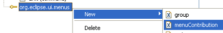 org.eclipse.ui.menus 에서 menuContribution는 사용자 인터페이스에서 메뉴가 표시되는 위치를 정의할 수 있는 locationURI 속성을 가지고 있습니다. locationURI 속성에는 기본적으로 menu:와 toolbar:, popup: 으로 시작하며 그다음에는 메뉴가 표시될 위치를 지정할 수 있습니다. 예를 들어, 파일 메뉴(ID:fileMenu)의 하의 메뉴에 위치시키려면 아래와 같은 위치식을 이용합니다.