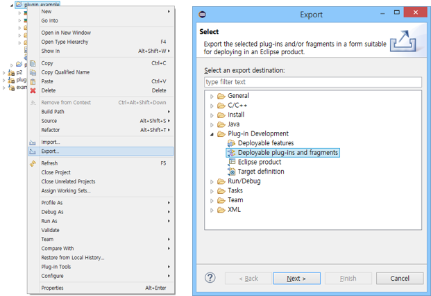 Export -> Plug-in Development -> Deployable plug-ins and fragments 선택 후 Next 클릭합니다.
