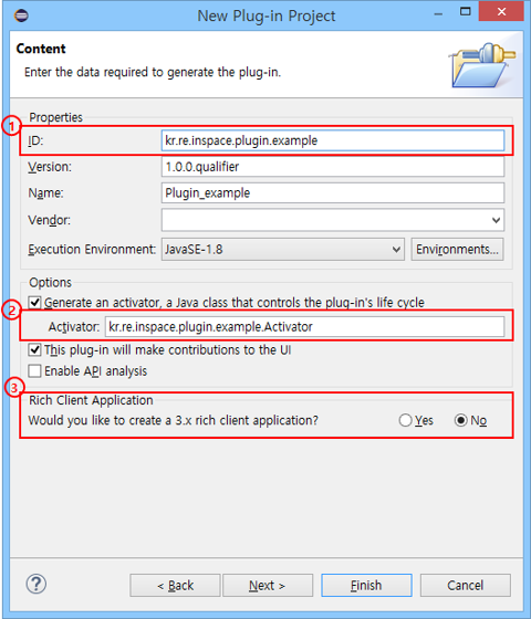 플러그인 ID(Bundle-SymbolicName)는 단 하나의 플러그인을 식별하기 위해 설계된 것이며 일반적으로 자바 패키지 이름 규약(예: com. <회사명>. <제품명>)을 이용해 구성됩니다.