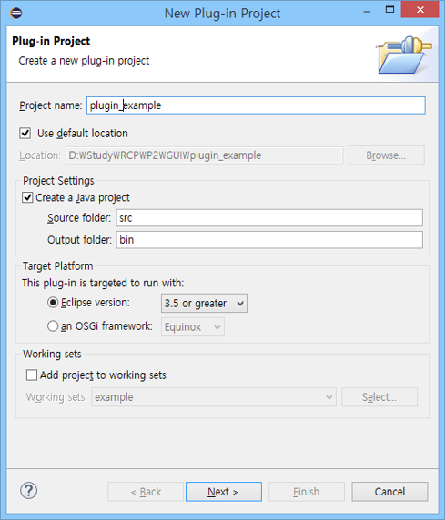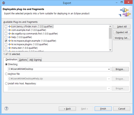 배포하는 플러그인 프로젝트를 선택하고, Directory란에 배포하는 폴더를 지정하고, Finish를 클릭합니다.