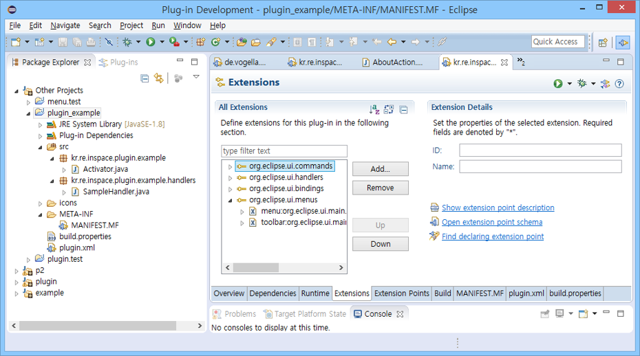 위와 같이 플러그인 프로젝트가 생성되면 MANIFEST.MF 클릭 -> Extensions 탭으로 이동 기본적으로 “Hello, World Command”를 선택하면 commands, handlers, bindings, menus 4개의 트리가 만들어집니다.