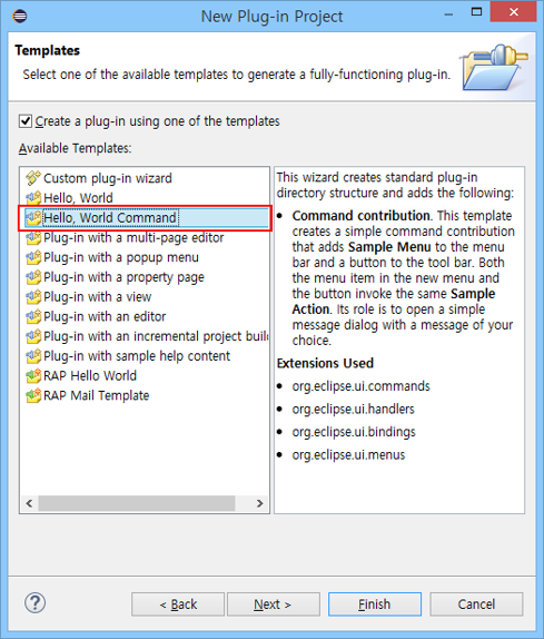 “Hello, World Command” 선택 후 Finish 클릭합니다.